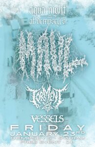 A frosty start to 2026 and The Aquarium’s 20th year as a venue! The first Aqua Night at Dempsey’s on Friday, January 23rd is a doozy with the Midwest Death boys in Maul. But not coming alone, they bring Duluth friends in Torment and FM metalheads Vessels.