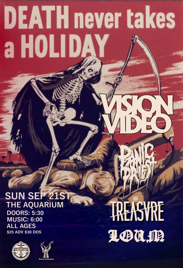Vision Video with Panic Priest and TREASVREThe Internet’s beloved Goth Dad, Dusty Gannon, will be bringing his prolific band, Vision Video to The Aquarium on Sunday September 21st with guests Panic Priest, TREASVRE and our hometown darkwave duo, Loum for the ultimate goth event of the year. Sunday Sep 21stAll AgesDoors: 5:30Music: 6:00pm$25 Adv $30 […]