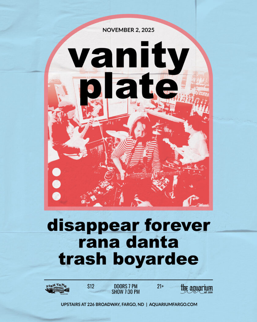 The Aquarium and Fish Tank Promotions are proud to present Vanity Plate w/ support from Disappear Forever, rana danta, and Trash Boyardee on Sunday, November 2.
