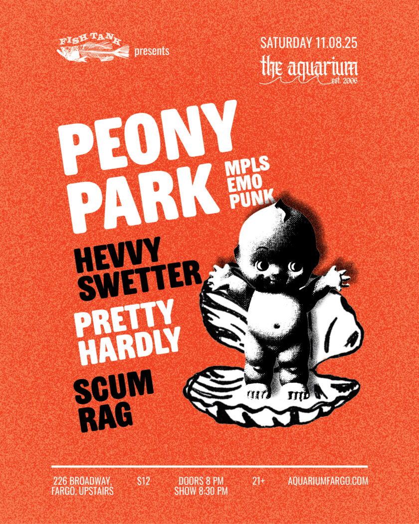 Twin Cities dynamic emo punks Peony Park are at The Aquarium in downtown Fargo on Saturday, November 8, with support from Hevvy Swetter, Pretty Hardly, and Scum Rag! Come out n party down.