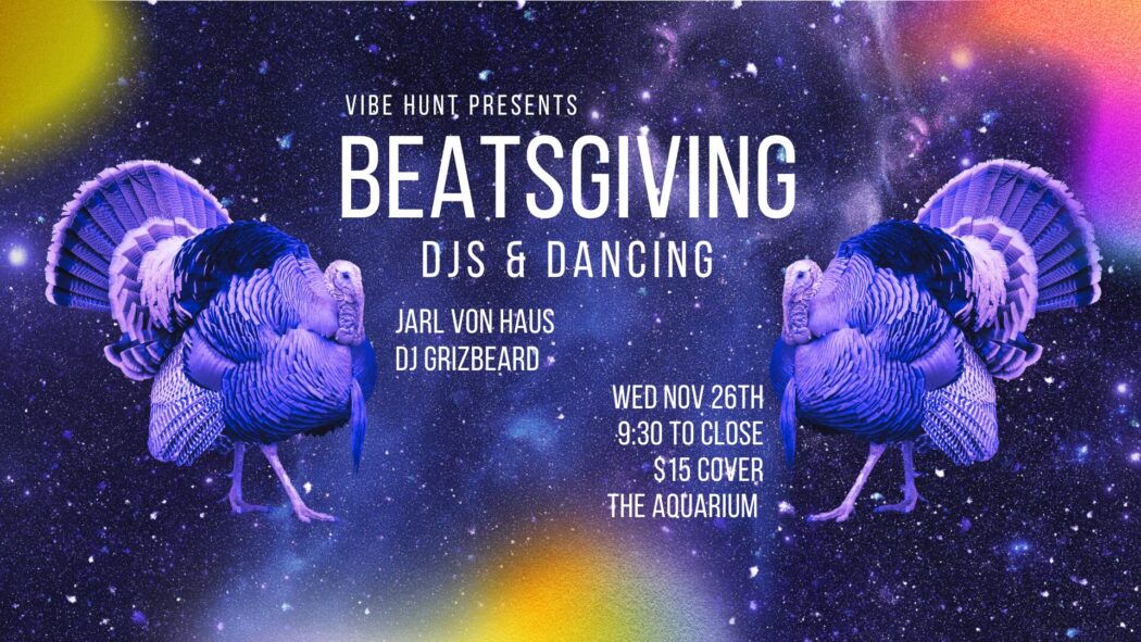 Start your Thanksgiving holiday off right by celebrating BeatsGiving, a night of dancing and music. Enjoy tracks mixed by Jarl Von Haus and DJ GrizBeard $15 Cover Cash Cover at the Door Hosted by Vibe Hunt